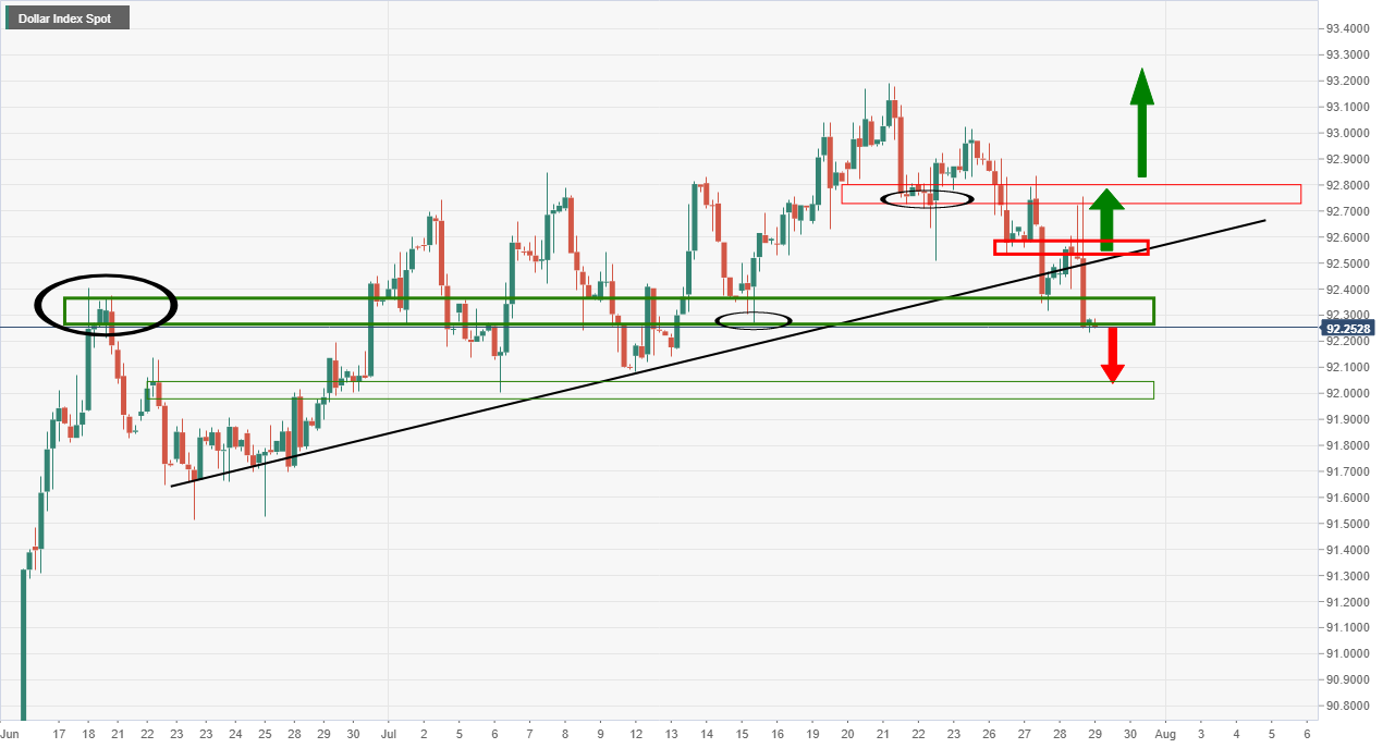 周四,在美联储新闻发布会上的鸽派倾向打压了美元之后,美元兑瑞郎正在累积下行。 4小时图 随着美元兑瑞郎开始反弹,测试反向趋势线和阻力位,接近92.500-60,美元兑瑞郎预计将面临上行压力。 下面的分析说明了预期的上行目标。 日线图 在美联储引发的下行飙升之后,日线图需要进行修正。形结构是一个引人注