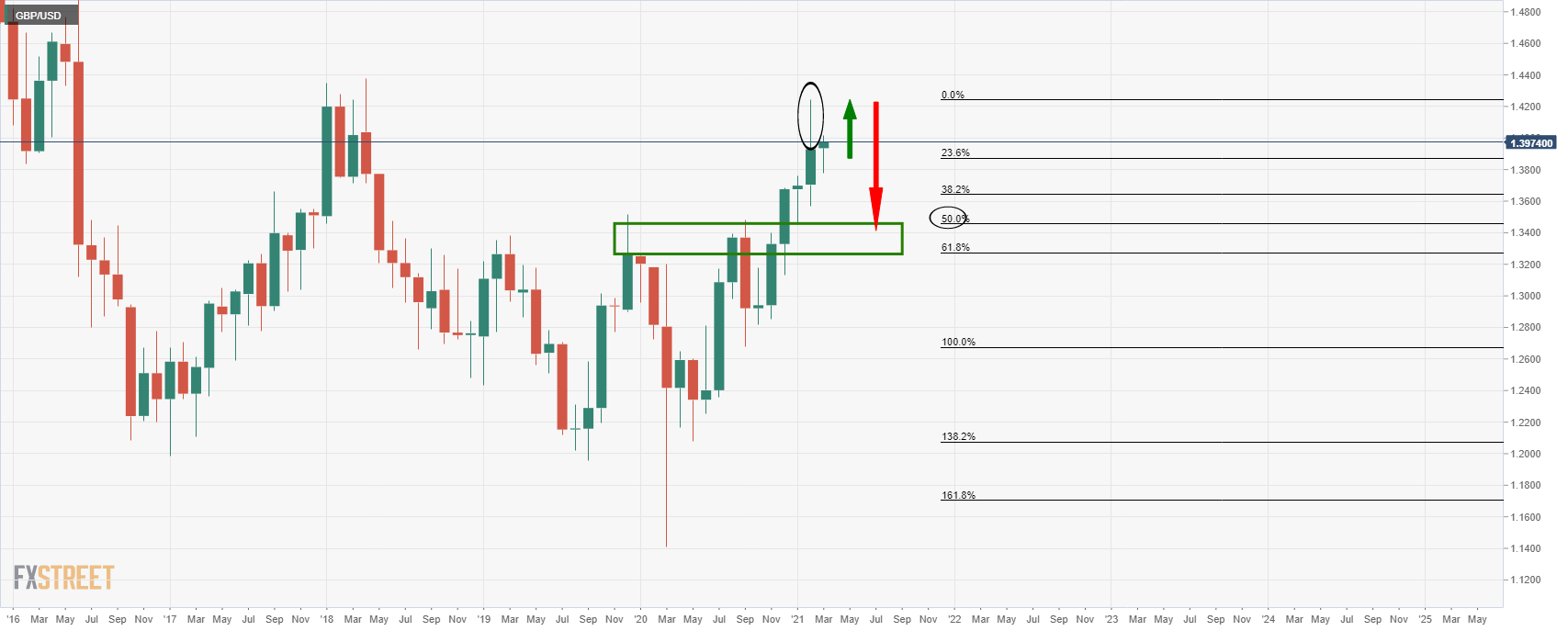 英镑/美元试图在较长时间内深入阻力区域,下面是一个自上而下的分析。 月线图 3月份的看跌行情代表了每周和每天的拒绝,这些拒绝建立了值得注意的支撑结构。 然而,整体前景是悲观的,因为人们预计价格将修正月度波动。 周线图 可以看出,英镑/美元正试图从支撑位向上移动,并且有望填补每月和每周的价格波动。
