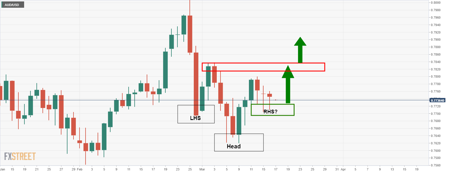 澳元/美元 根据之前的分析,澳元/美元反向头肩顶在此关头是最可能的结果。日线图提供了两种前景,一种是当价格突破78.6%时形成w形态走势,另一种是形成更复杂的反向多头头肩顶走势: 日线图上,已经演变成反向头肩的右肩(RH)。澳元/美元多头在这个支撑点上发挥作用,预计价格将向上移动。多头可以在较低的时间框架