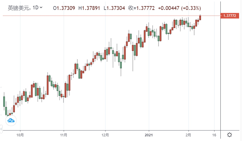 由于美元疲软,英镑兑美元汇率已经触及多年新高。由于英国继续全力推进免疫接种,英镑兑美元可能会飙升至1.38以上。 FXtrt分析师约海·埃拉姆(Yohayla)报导。 美国总统拜登可能会通过他所希望的大部分冠状病毒救助方案——提高发行更多债务债券的必要性,国债收益率和美元恢复下降趋势。然而,目前的干扰已经导致了暂