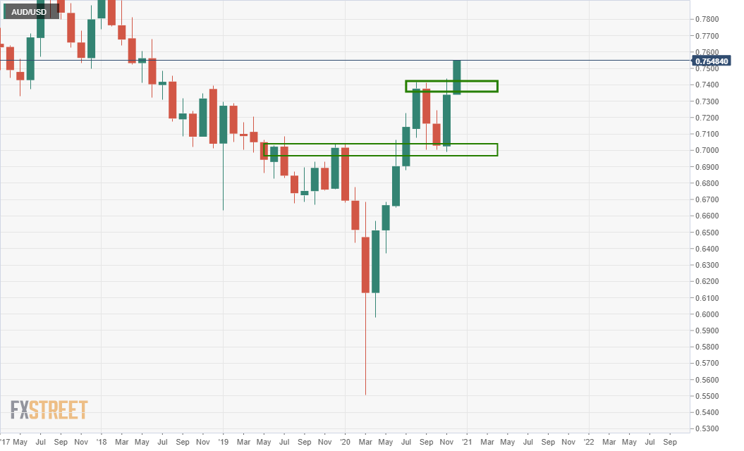 周五,澳元/美元最近创下了新的牛市周期高点0.7554,在亚洲时段上涨了约0.2%。 月图 月线图显示价格已经超过了之前的突破结构,并将在之前的修正高点形成新的支撑。 周图 周线图提供了与最新的看涨冲动的61.8%费波纳奇相吻合的结构。 日图 同时,支撑区与当前高点38.2%费波纳奇回档位相吻合。