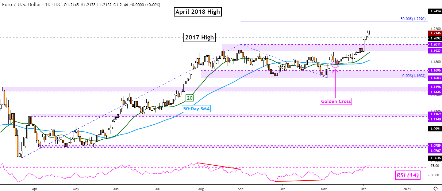 周一,欧元兑主要货币似乎即将出现技术突破,欧元/美元和欧元/英镑温和看涨,欧元/日元走势中性。 欧元/美元 欧元/美元上周刷新2020年新高,同时也创下2018年4月底以来的最高水平,并突破了关键阻力区间1.1932-1.2011,正打开上行空间测试50%斐延展位1.2290。11月20日简单移动均线上穿50日简单移动均线,构筑金叉形态