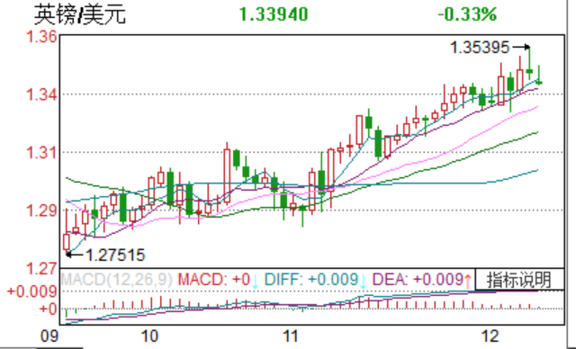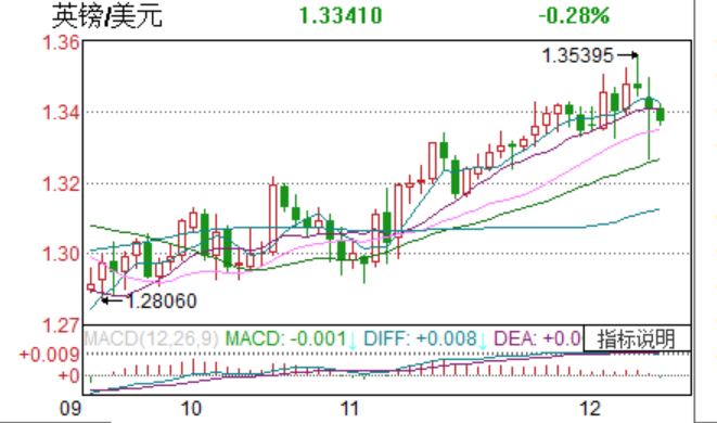 英镑/美元连续第二日下跌,收报1.3375,跌幅0.49%。 日线图 英镑/美元的日线图显示,3月20日,价格触及1.1412后持续走强,至12月4日最高触及1.3540后回落,当日录得长上影十字星。12月7日,价格一度暴挫逾200点至1.3224,随后反弹逾百点至1.3330附近。 值得注意的是,此前KDJ指标连续出现顶背离现象,或是近两个交易