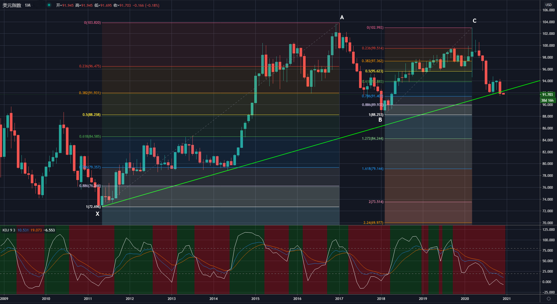 美元指数一度跌至91.50附近,刷新今年低点,日内有望形成看涨。 月线图 美元指数的月线图显示,2011年5月,价格下探72.70后启动数年牛市行情,至2017年1月最高触及103.82后见顶回落并跌至88.25(2018年1月低点),构成了0.5回退模式。 随后,行情持续反弹,但受阻于103关口(2020年3月高点)后再度下挫,目前跌破X