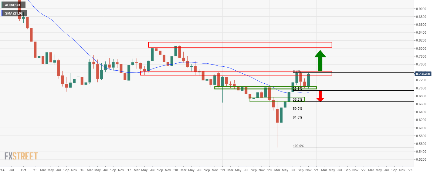 澳元/美元在0.73区域中段追逐高点。空头正在供应区寻找做空机会,但等待每日支撑位的突破。 下面是一个自上而下的分析来说明下一个看跌机会可能在哪里出现。 月图表 周线图 月度和周线图显示,价格处于供应区间,周高点被强烈遇阻。 预计该区域将持有,并在市场一再下跌时创造做空机会。 日图表 看空者