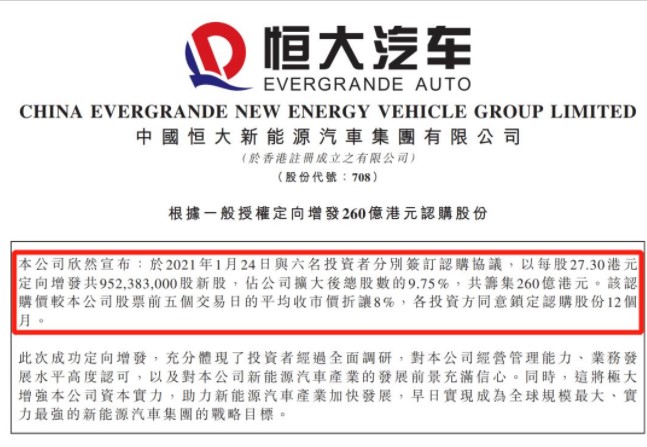 1ÔÂ24ÈÕÍí£¬ºã´óÆû³µ(0708.HK)¹«²¼£¬ÒÑÓëÁùÃûͶ×ÊÕß·Ö±ðÇ©¶©ÈϹºÐÒ飬ÒÔÿ¹É27.30¸ÛÔª¶¨ÏòÔö·¢¹²9.52ÒÚ¹Éйɣ¬¹²Òý×Ê260ÒÚ¸ÛÔª¡£¾ÝϤ£¬ÕâÊÇÊÇÐÂÄÜÔ´Æû³µ²úÒµÀúÊ·ÉϹæÄ£×î´óµÄ¹ÉȨÈÚ×ÊÖ®Ò»¡£