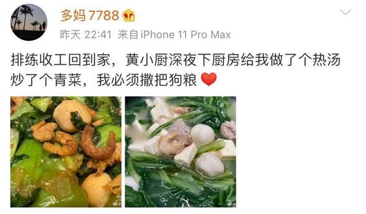 近日,孙莉在社交平台上晒出了两张美食的图片,并表示自己排练收工回到家,黄磊深夜为她下厨做了一菜一汤,所以必须撒把狗粮。