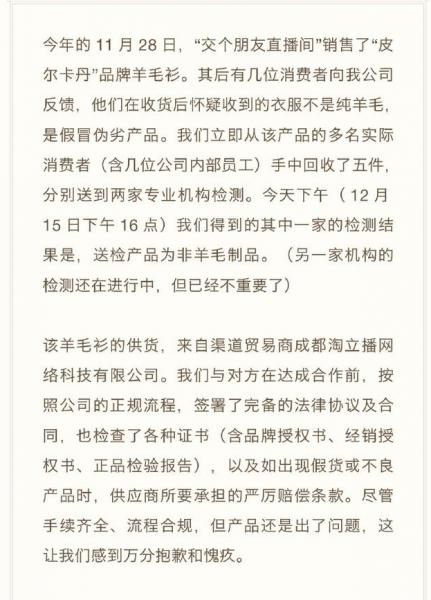 12月15日,罗永浩直播带货微博“交个朋友”发布《关于11月28日交个朋友直播间所销售“皮尔卡丹”品牌羊毛衫为假货的声明》,承认所售出部分羊毛衫为假货。