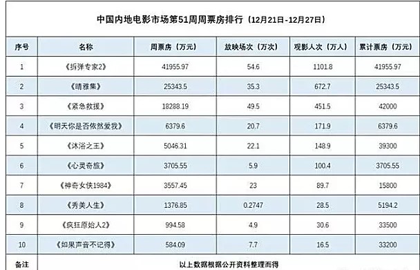 2020年第51周(12月21日至12月27日)内地影视周票房成绩为11亿,环比第50周大涨69.75%。其中,《拆弹专家2》、《晴雅集》、《紧急救援》分别以4.19亿、2.53亿、1.82亿成绩,位列当周周票房排行前三甲。