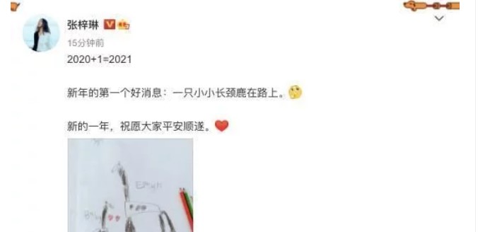 张梓琳在文中说,"2020+1=2021,新年的第一个好消息是,有一只小小长颈鹿在路上。新的一年祝愿大家平安顺遂。