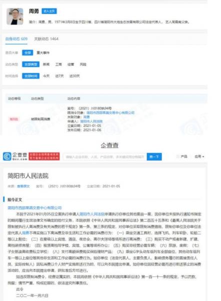 企查查APP显示,周震南父亲周勇于1月5日新增限制高消费令,涉及案号为(2021)川0180执94号,限消令申请人为简阳市人民法院。