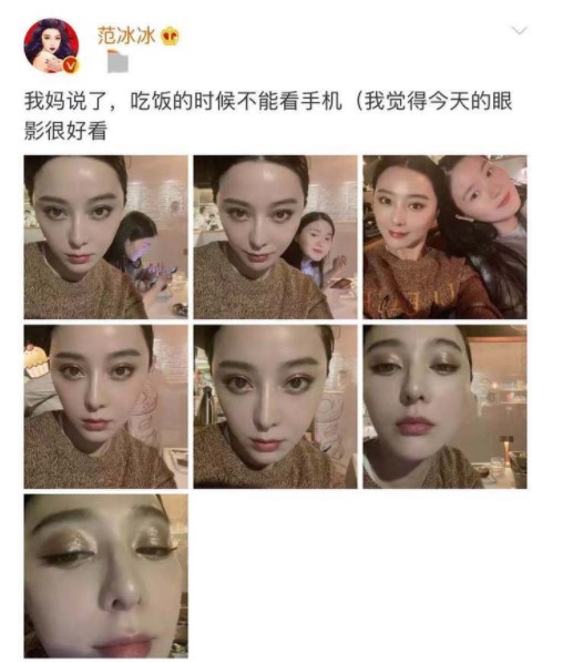 2月7日,范冰冰晒出一组怼脸自拍,身后玩手机的小姐姐也出镜:我妈说了,吃饭的时候不能看手机。同时范冰冰还不忘提示照片重点“我觉得今天的眼影很好看 ”。