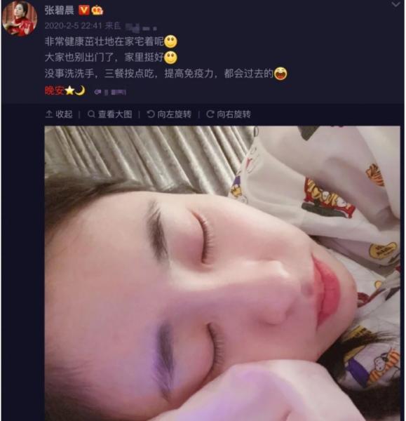 而张碧晨则曾在去年的2月5日晒出自己躺在床上睡觉的照片。