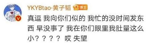 22日晚,黄子韬在微博为石玺彤专辑打call。因日前黄子韬发文对粉丝不满工作室一事表达失望,不少粉丝在评论区留言跟黄子韬道歉 ,他回应:“真逗,我像你们似的,我忙的没时间发东西,早没事了,我在你们眼里我肚量这么小???? 哎 失望。”