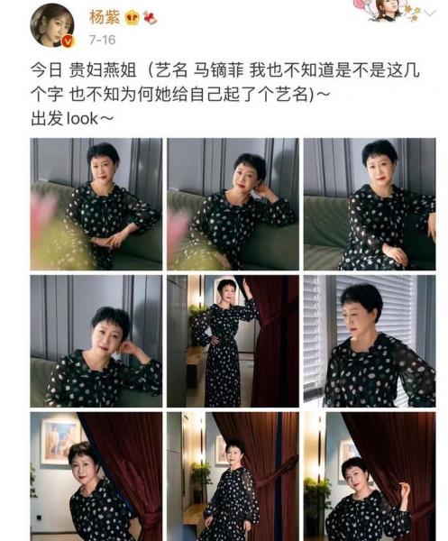 7月16日晚,杨紫罕见在个人社交平台分享了一组妈妈的九宫格美照,还发文甜喊妈妈是贵妇:“今日 贵妇燕姐(艺名 马镝菲 我也不知道是不是这几个字 也不知为何她给自己起了个艺名)~出发look~”。