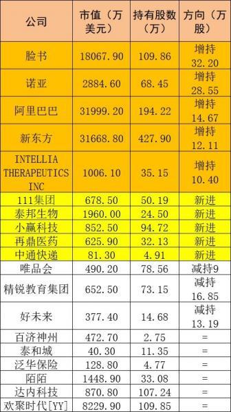 此外,诺亚、新东方和制药公司INTELLIA THERAPEUTICS INC也分别获得28.55万股、12.11万股和10.4万股的增持。
