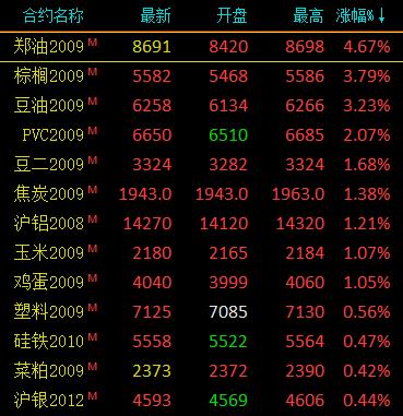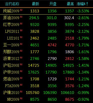 7月20日讯 国内期货市场早盘开盘,商品期货涨跌参半,油脂类延续涨势,菜油涨逾3%,棕榈油涨逾2%;能化品飘绿,LPG跌逾2%,沥青、原油跌近2%;有色板块,沪铝涨逾1%,沪镍、沪锌、沪铅跌逾1%。