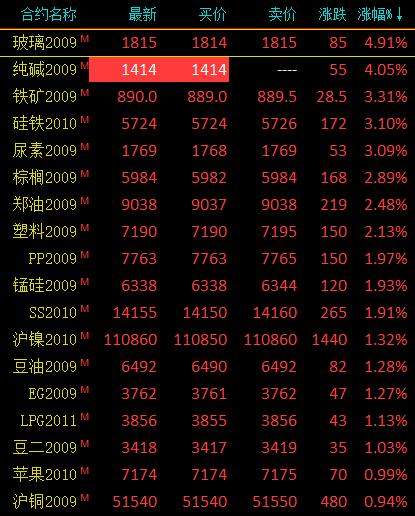 8月4日讯 国内期货市场收盘,商品期货多数收涨,纯碱期货主力合约涨停。玻璃、纯碱涨超4%;硅铁、铁矿、尿素涨超3%;棕榈、郑油、塑料涨超2%;豆油、SS不锈钢、沪镍涨超1%。棉纱大跌近2%,鸡蛋、焦煤跌近1%。红枣、菜粕、原油小幅下跌。