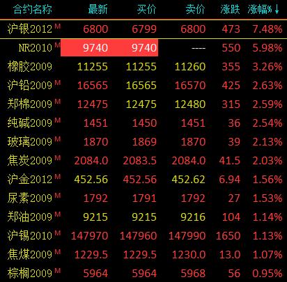 8月7日讯 国内商品期市开盘,沪银直线拉升触及涨停,20号胶延续夜盘涨停,橡胶涨逾3%;有色多数上涨,沪铅涨逾2%。