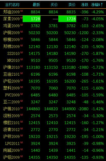 8月10日讯 国内期货市场收盘,商品期货多数下跌,尿素主力合约跌停。菜油、尿素跌超4%,鸡蛋、沪铜、棕榈跌超2%,郑棉、PVC、豆油、塑料、沪铅、沥青跌超1%;豆粕、郑煤、铁矿小幅下跌。红枣、苹果涨超4%,锰硅、郑醇涨超1%。