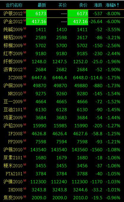 8月12日讯 国内期货市场收盘,商品期货多数下跌,沪银、沪金跌停,纯碱跌逾3%,红枣跌逾2%,沥青、沪铜、鸡蛋、沪铅、沪锡、尿素、沪镍跌逾1%;郑煤、锰硅、郑棉涨逾1%。