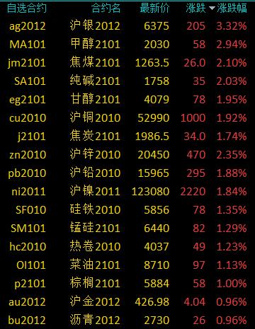 9月1日讯 国内期货市场收盘,商品期货多数收涨,沪银涨逾3%,郑醇涨近3%,沪锌、焦煤、纯碱涨逾2%,沪铜、沪铅、沪镍、焦炭、硅铁、锰硅、热卷涨逾1%;玻璃、尿素、菜粕、豆粕跌逾1%。