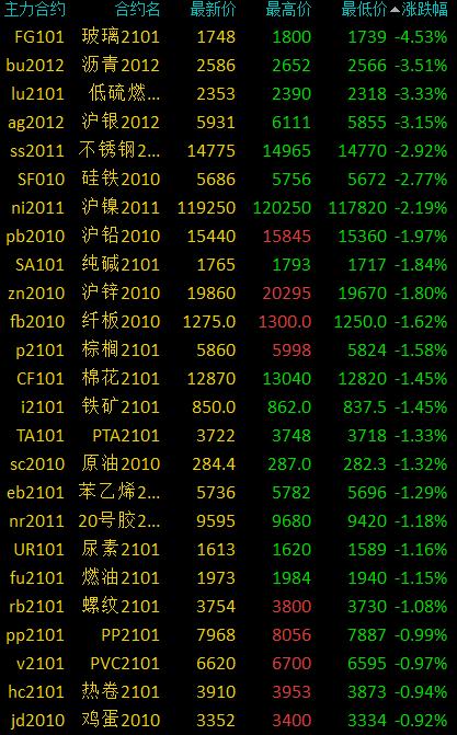 9月4日讯 国内期货市场收盘,商品期货大面积收跌,能化类跌幅居前,玻璃跌逾4%,沥青、低硫燃料油、沪银跌超3%,不锈钢、硅铁、沪镍跌超2%;农产品(7.82 -1.76%,诊股)部分上涨,豆一涨超3%,淀粉、菜粕、豆粕、郑醇涨超1%。