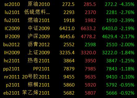 9月7日讯 国内期货市场收盘,商品期货涨跌不一,原油大跌逾4%,LU、燃油等跌超2%,PP、热卷等跌超1%,螺纹、沪银等小幅下跌;玉米涨超2%,菜粕、红枣等涨超1%,豆油、豆一等小幅上涨。