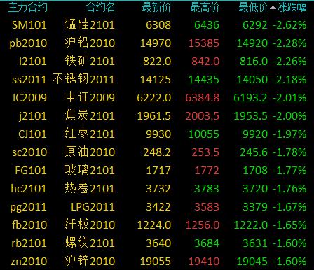 9月10日讯 国内期货市场收盘,商品期货多数下跌,黑色系、有色金属走弱。铁矿、不锈钢、锰硅、沪铅跌超2%,LPG、玻璃、螺纹等跌逾1%,沪镍、沪锡等小幅下跌;淀粉涨超3%,EB涨逾2%,玉米、豆粕等涨超1%,豆二、纯碱等小幅上涨。