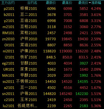 9月14日讯 国内期货市场收盘,商品期货多数收涨,农产品(7.63 -0.65%,诊股)涨幅居前。棕榈涨逾4%,豆二、豆油涨逾3%,豆粕、菜粕、沪锌、沪镍、郑油、铁矿涨逾2%。轻工板块跌幅居前,玻璃跌逾2%。