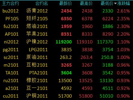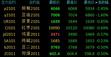 10月16日讯 国内期货市场开盘,商品期货多数上涨,棕榈跌近3%,豆油、豆二等跌超1%,鸡蛋、塑料、玻璃等小幅下跌;苹果、沥青、短纤涨超1%,沪镍、沪铜等小幅上涨。