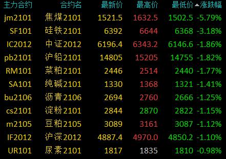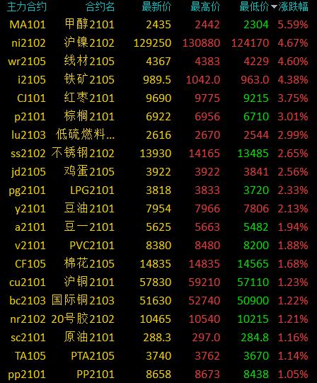 12月11日讯 国内期货市场收盘,商品期货走势分化,黑色大涨后有所回落。甲醇主力合约涨超5%,沪镍、铁矿涨超4%,红枣、棕榈涨超3%,不锈钢、鸡蛋、LPG、豆油涨超2%。焦煤大跌逾5%,硅铁跌超3%,沪铅、纯碱、沥青、豆粕跌超1%。