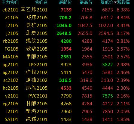 国内商品期货开盘:多数上涨,苯乙烯涨超5%、郑煤涨超4%