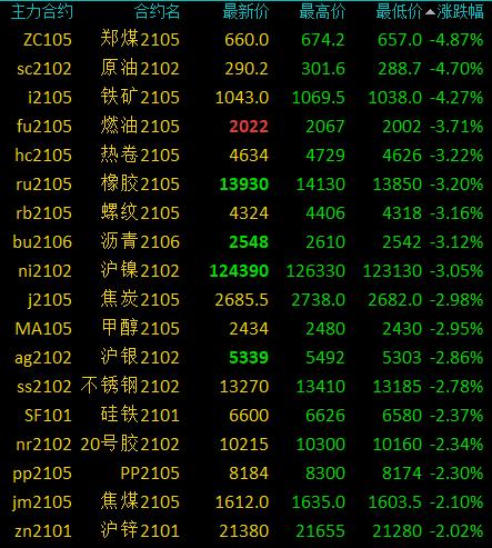12月23日讯 国内期货市场开盘,商品期货多数下跌,郑煤、原油跌超4%,铁矿石、沪镍、沪银跌超3%,橡胶、螺纹、焦炭跌超2%。