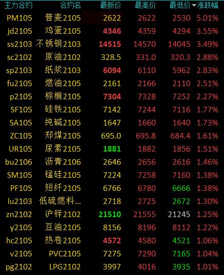 1月7日消息 国内期货市场开盘,商品期货多数上涨,鸡蛋涨逾3%,硅铁涨近3%,原油、不锈钢、棕榈油涨逾2%。