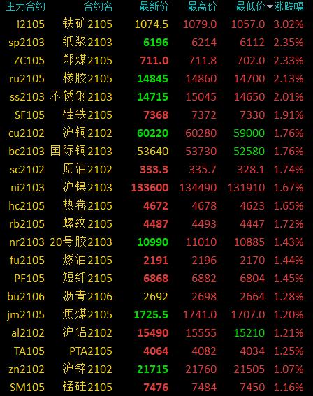 1月8日消息 国内期货市场开盘,商品期货多数上涨,铁矿涨超3%,纸浆、郑煤等涨逾2%,热卷、螺纹等涨超1%,苹果、玉米、淀粉等小幅上涨;PVC跌超1%,PP、塑料等小幅下跌。生猪期货今日挂牌上市,开盘跌逾3%。