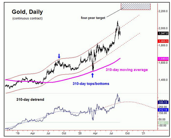 黄金上周先涨后跌,整体呈现回调态势。不过和过去几周所言一样,中期走势并未出现显著改变。至今年年末的大行情上,依旧是看涨为主。310天周期顶部完成之后,黄金才会形成新一个大级别的调整。而这一周期的通道底部则是中期支撑,目前来看测试支撑的可能性很低。多头目标2212-2340.56最终可以达成的概率超过85%。只有在完成上述的大型目标之后,在2021年的一季度,黄金才有可能形成较大级别的调整。这个调整力度将是2018年8月以来之最。不过更长期来看,未来4-5年多头依然是主基调。