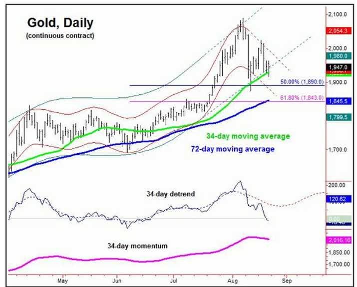 有了上行目标,下方的支撑也十分关键。中短周期上的34天均线支撑是主要焦点。在34天通道顶部触及并反转之后,黄金之前一波调整已经测试均线,考虑到周期目前处于下行通道之中,因此预计金价将沿着下轨进行寻找底部的动作。时间来看,月末及下月中上旬将完成筑底,这将是下一个中期买点。