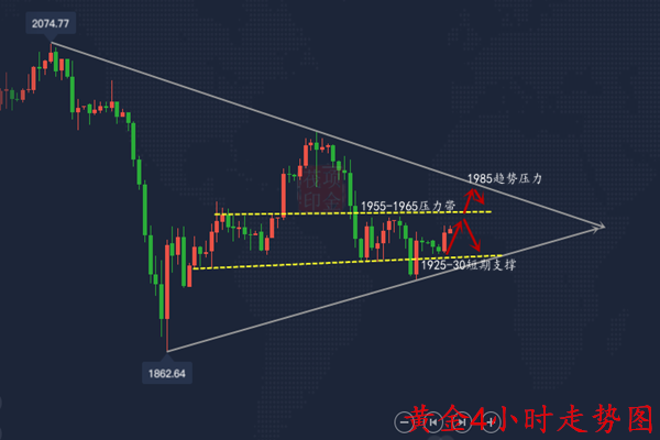 今天是周一,行情波动会偏小,可以选择在1925~1956震荡区间结合k线测试上下沿支撑压力的收线情况,进行高抛低吸,上方没有突破阻力1955之前可以偏向高抛。一小时看,1925~1956震荡区间更加明显,并且目前行情也正处于更大范围之内的三角形震荡之中,继续关注三角形突破。并且布林轨收口并且向下,如果行情抬升,触碰布林线上轨,可能会形成布林线背离,结合前高1945附近密集成交区,如果又出现见顶信号,这是一个较优质的机会。所以日内操作上杨振金建议区间不破高抛低吸即可。短线上方阻力关注1955/1965。下方关注支撑1920/1915/1906。