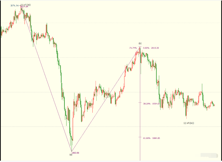 小时图上看,金价处于自2015美元开启的下行(c)浪中,跌至(c)浪50%目标位1910美元附近,下一道支撑位看向61.8%目标位1885美元。(c)浪是自2075美元开启的调整((iv))浪的子浪。