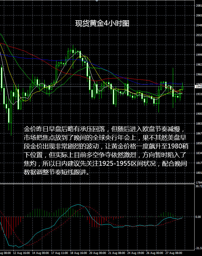 从现货黄金4小时图看,金价昨日早盘后略有承压回落,但随后进入欧盘节奏减慢,市场把焦点放到了晚间的全球央行年会上,果不其然美盘早段金价出现非常剧烈的波动,让黄金价格一度飙升至1980稍下位置,但实际上目前多空争夺依然激烈,方向暂时陷入了焦灼,所以日内建议先关注1925-1955区间状况,配合晚间数据调整节奏短线跟进。