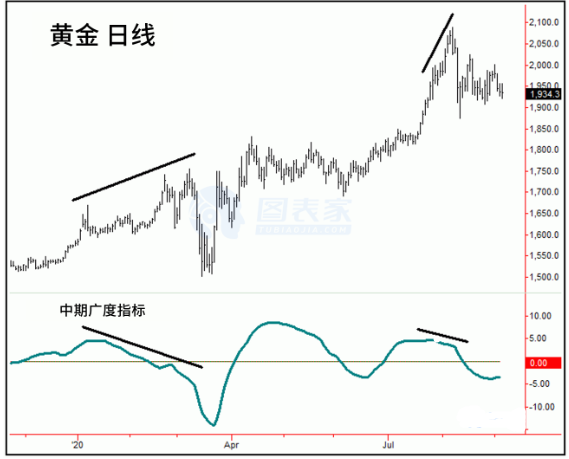 3.技术指标黄金的中期广度指标在7月底开始显示出与价格的背离,并由此释放酝酿大跌的警告。