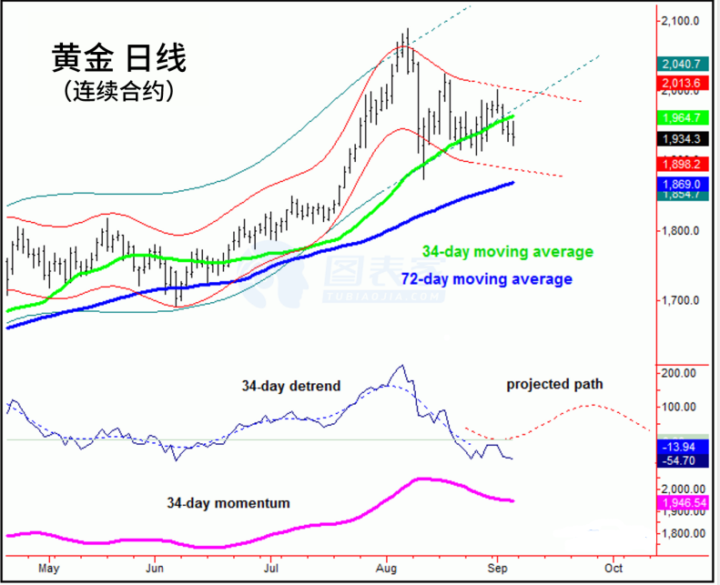 相对于310天周期的中期上升趋势而言,黄金处于短期的逆势回调走势之中。如果观点是正确的,那么在跌势结束后,黄金将在未来几个月升至2200美元甚至更高,然后再形成下一个中期高点。从这个峰值开始的更大的降幅预计将持续至明年春季,届时将形成下一个中期底部。