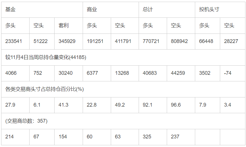 截止11月10日当周COMEX(纽约商品期货交易所)黄金期货分类持仓报告: