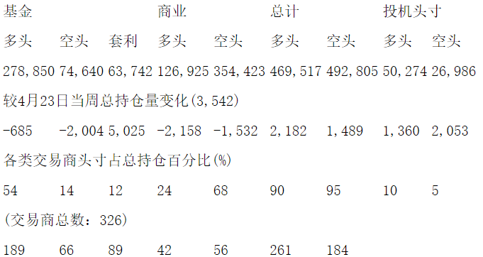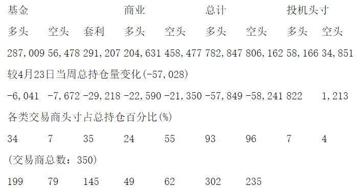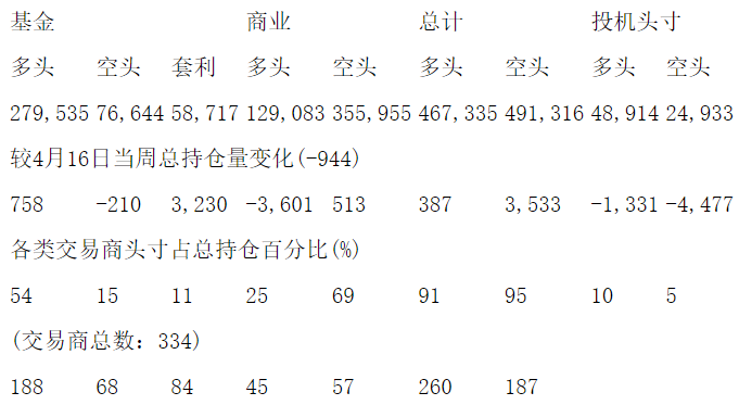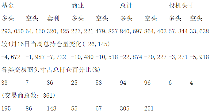 美国商品期货交易委员会(CFTC)最新公布截止4月23日当周COX黄金期货分类持仓报告: 合约单位:100金衡盎司总持仓量:516249