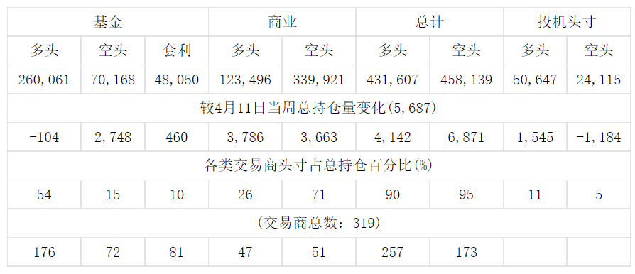 美国商品期货交易委员会(CFTC)最新公布截止4月18日当周COX黄金期货分类持仓报告: 合约单位:100金衡盎司总持仓量:482254