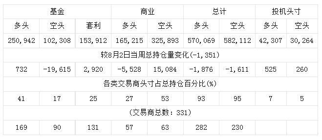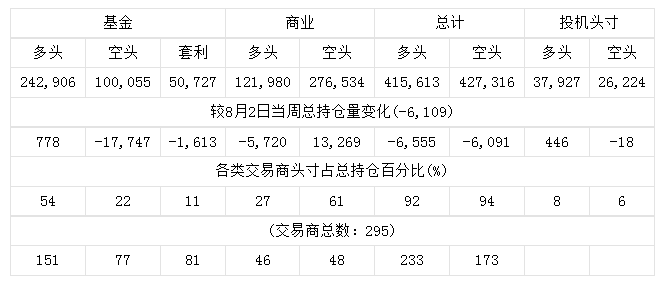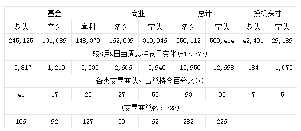 美国商品期货交易委员会(CFTC)最新公布截止8月9日当周COX黄金期货和期权分类持仓报告: 合约单位:100金衡盎司总持仓量:612376