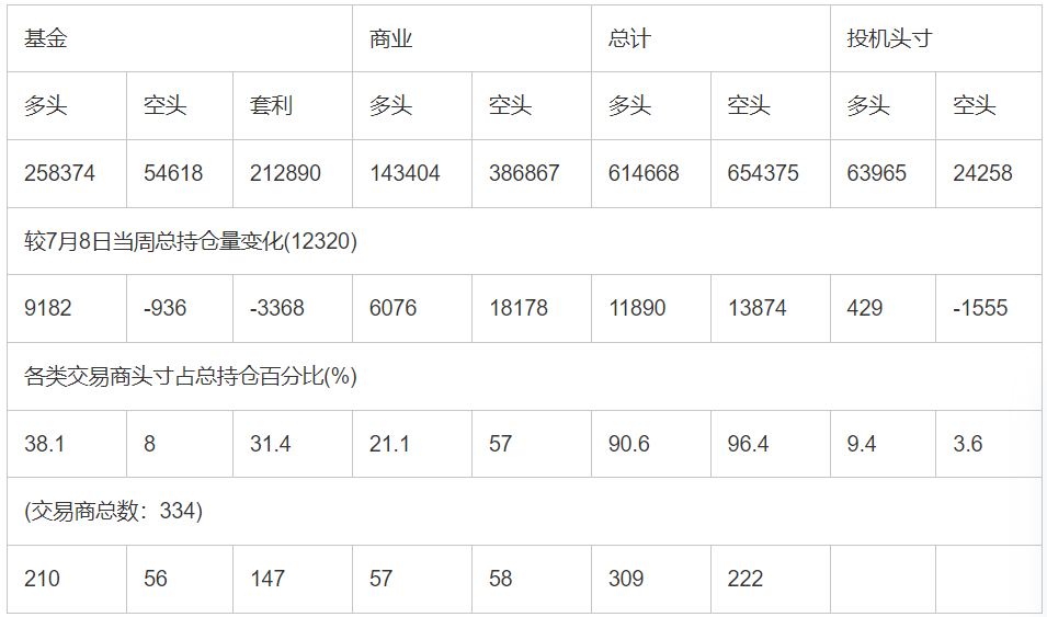 截止7月15日当周COX(纽约商品期货交易所)黄金期货和期权分类持仓报告: 合约单位:(100金衡盎司的合同)总持仓量:678633