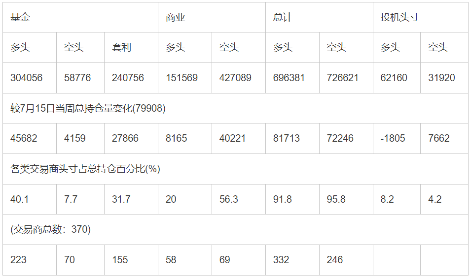 截止7月22日当周COX(纽约商品期货交易所)黄金期货和期权分类持仓报告: 合约单位:(100金衡盎司的合同)总持仓量:758541