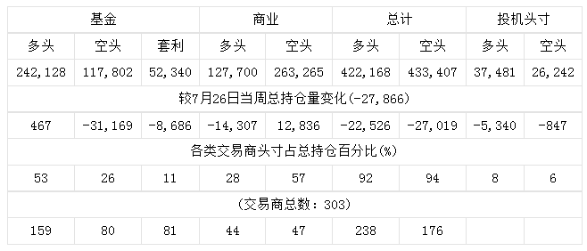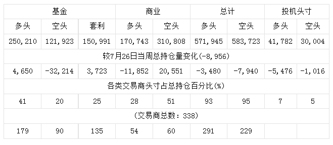 美国商品期货交易委员会(CFTC)最新公布截止8月2日当周COX黄金期货和期权分类持仓报告: 合约单位:100金衡盎司总持仓量:613727